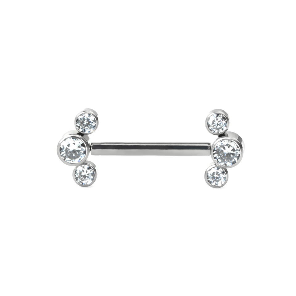 Činka je vyrobena z titanu, což je jeden z nejlepších materiálů, který svým bradavkám můžete dopřát. Čiré kamínky na každém konci jsou kubické zirkony a jsou zasazeny do kovu. Větší kamínek má 3,9 mm a ten menší 2,9 mm. Můžete si také vybrat z různých barev kamínků.