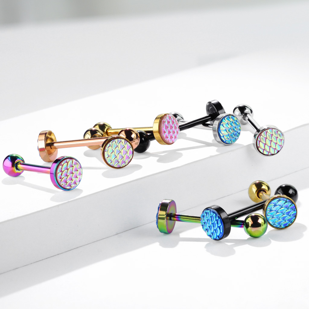 Na obrázku výše vidíte velmi originální piercing do jazyka. Tento šperk má placatou horní kuličku s povrchem, který mění barvu a vypadá jako šupiny. Šupiny jsou vyrobeny z pryskyřice, díky které na světle mění svoje odstíny. Jestli si vyberete model s růžovými šupinami, uvidíte při jeho pohybu různé růžové odstíny. Kromě toho si můžete také vybrat z různých barev tyčinky - to vše dodá šperku odlišný a svěží vzhled.