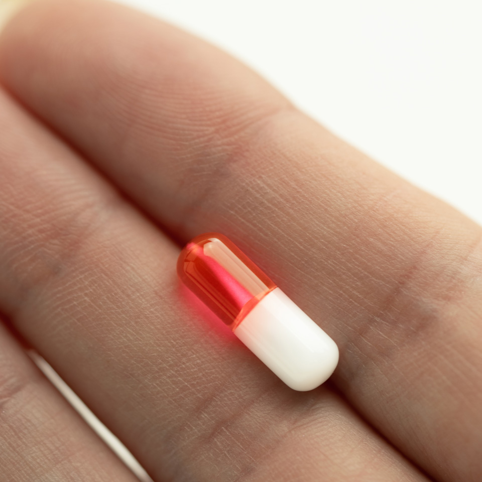 Velikost dvoubarevné pilulky je inspirovaná skutečnými kapslemi o délce 16 mm a tloušťce 5 mm. S běžnými léky to má ale pramálo společného. Tato originální kapsle je dostupná v sedmi různých barevných kombinacích. U všech modelů je jedna polovina pilulky bílá a barvu druhé půlky si vyberete v nabídce výše, na pravé straně od obrázku.