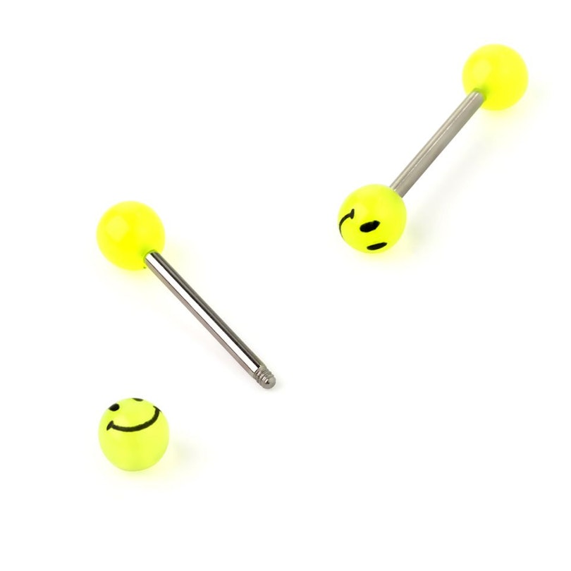 Sladký a vtipný piercing do jazyka, který je světlý a tmavý zároveň a je zdobený smajlíkem.