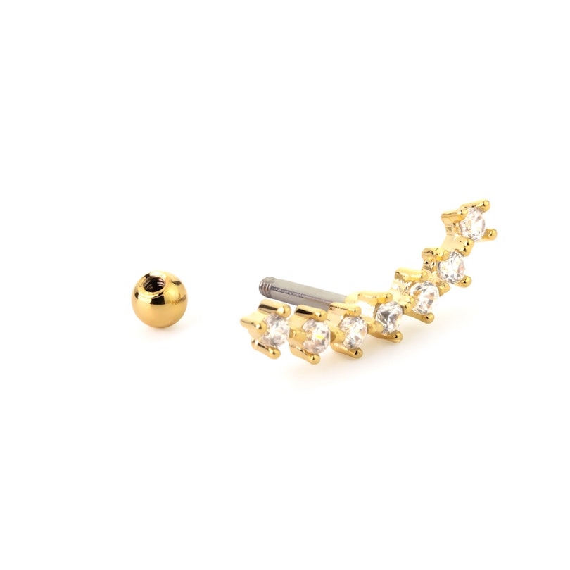 Skvělé šperky do uší doplní každý vzhled a pokud potřebujete něco nápadnějšího je tento šperk pro vás ten pravý. Tato činka s zahnutým topem se třpytí jako řada hvězd na noční obloze. Tento šperk sám o sobě přitahuje dostatek pozornosti, ale je také dokonalým doplňkem v kombinaci s různými kousky. Můžete ho například nosit v helixu, conchi nebo lalůčku. Točte s ním jak jen se vám zlíbí a zkoušejte různé kombinace.
