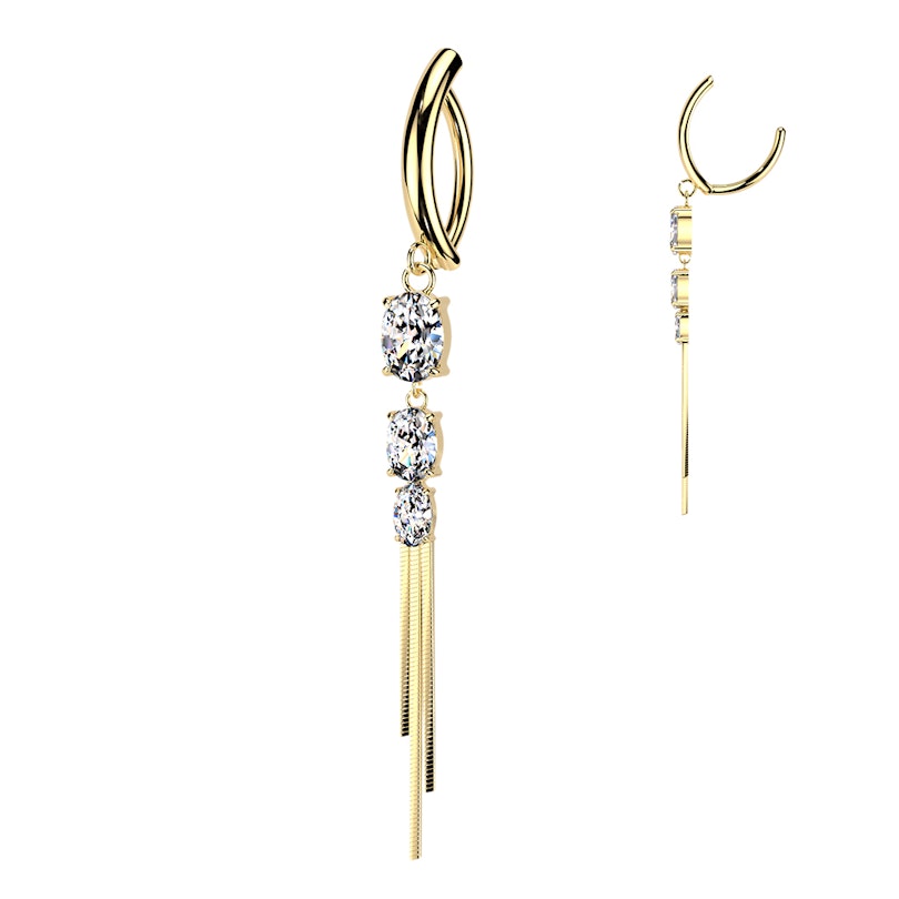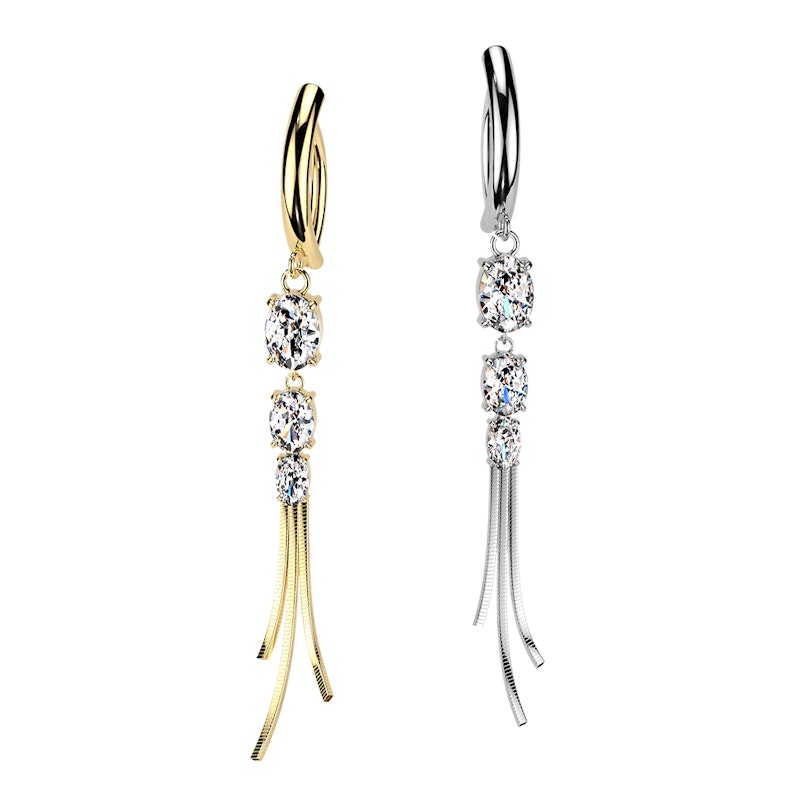 Clicker do pupíku s kamínky a řetízky přidá vašemu piercingu v pupíku extra detail. Kamínky sedí uprostřed v krapnách a dole visí jemné řetízky pro víc vyladěný vzhled. K dostání ve zlaté a stříbrné, je to šperk, po kterém sáhneš, když chceš něco víc než obyčejnou činku.
