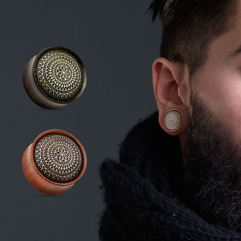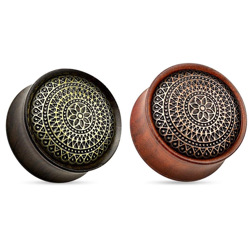 Přírodní materiál, jako dřevo, dovolí vaší pokožce dýchat, i když máte nasazený šperk a díky tomu předejdete nepříjemnému zápachu. Tento plug je dostupný ve dvou různých dřevěných variantách. Vyberte si z načervenalého dřeva palisandru a nebo tmavého dřeva ebenu. Přední strana plugu je zdobená mosazí: v modelu z palisandru má měděnou barvu, zatímco u druhého modelu si zachovala svou mosaznou barvu. Oba modely krásně kontrastují s přirozenou barvou dřeva. Zlatý vzor nad tmavým plugem dodává šperku úžasný starožitný vzhled, zatímco načervenalé dřevo úžasně souzní s mosazným motivem.