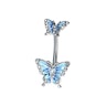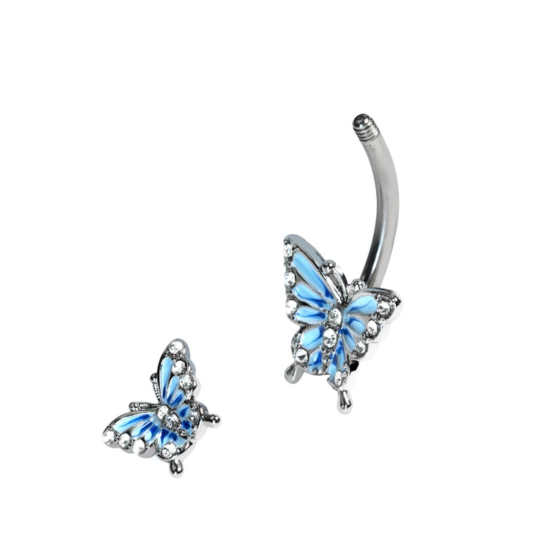 Tento piercing do pupíku není zdoben jen jedním, ale hned dvěma motýlky v modré barvě - velký krasavec je na spodní kuličce a jeho drobné dvojče je na horní kuličce. Oba mají na křídlech a tělech malé třpytivé kamínky.
