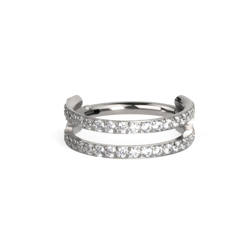 Tento dvojitý kroužek je báječný a pyšní se dvěma půlkruhy, které jsou lemované čirými zirkony. Pokud jste fanouškem třpytu a lesku, tak proč si tu radost nezdvojit?