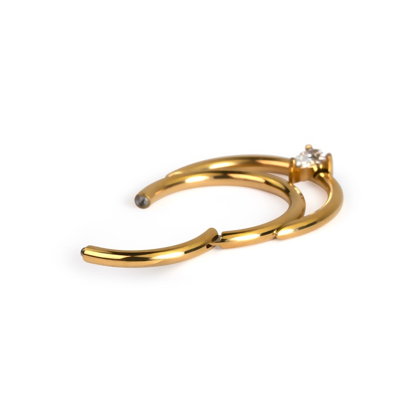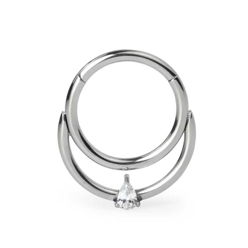 Tento dvojitý titanový segment má závěsné otevírání a kamínek ve tvaru slzy. Tento krásný šperk díky svému kamínku ve tvaru slzy překonává klasickou eleganci tím, že propojuje 2 jednotlivé kroužky v jeden charismatický kroužek. Je k dispozici ve dvou barvách - zlaté a stříbrné. Má klasickou tloušťku 1,2 mm a dodává se ve dvou průměrech - 8 mm a 10 mm - díky čemuž je tento šperk ideální pro helix, daith nebo septum.