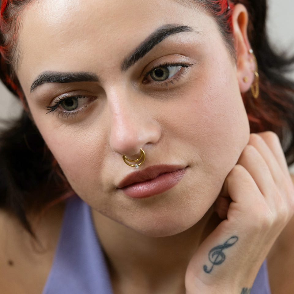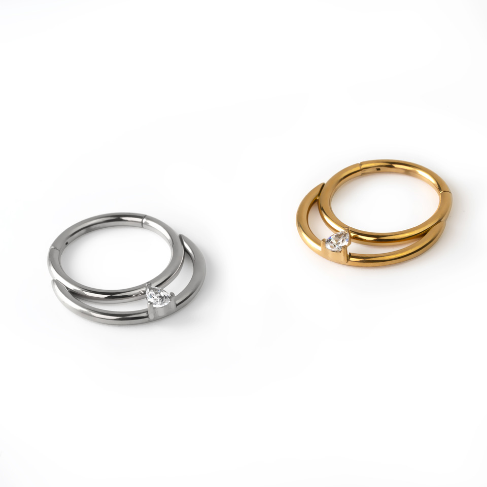 Tento dvojitý titanový segment má závěsné otevírání a kamínek ve tvaru slzy. Tento krásný šperk díky svému kamínku ve tvaru slzy překonává klasickou eleganci tím, že propojuje 2 jednotlivé kroužky v jeden charismatický kroužek. Je k dispozici ve dvou barvách - zlaté a stříbrné. Má klasickou tloušťku 1,2 mm a dodává se ve dvou průměrech - 8 mm a 10 mm - díky čemuž je tento šperk ideální pro helix, daith nebo septum.