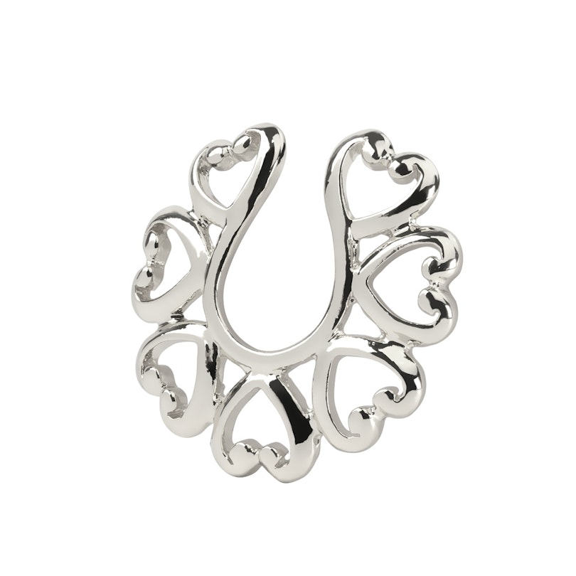 Přemýšlíte nad tím, že byste si nechali udělat piercing do bradavky, ale nemůžete se rozhodnout? Teď Vám přinášíme skvělou příležitost přesvědčit se, jestli by se Vám na Vás piercing v bradavce líbil. Představujeme Vám falešný piercing do bradavky se štítem se srdíčky naaranžovanými kolem Vaší bradavky.