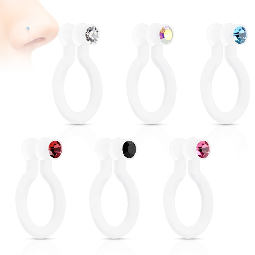 Těď máte skvělou příležitost pořídit si tento falešný piercing do nosu s malými kamínky,který můžete nosit i pokud v nemáte propíchnutý nos. Tento šperk se skládá z kroužku z PTFE a z drobného kamínku. PTFE je téměř průhledný, měkký plast, který je velmi přizpůsobivý a pružný. Kroužek však není celý uzavřený, ale místo toho má drobný otvor, díky kterému se na Váš nos nasune místo toho aby jím musel projít jako klasický piercing.