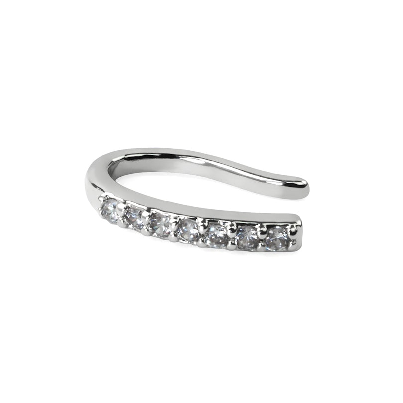 Tloušťka piercingu je cca 1mm, a jedna z jeho stran je krásně ozdobena sedmi drobnými čirými kamínky. Protože se jedná o šperk, který by neměl přijít do piercingových dírek, ale jen na povrch kůže, je šperk vyroben pouze z mosazi, která byla potažena vrstvičkou, která jí dodává lesklou, stříbrnou barvu.