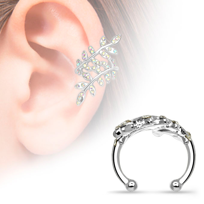 Název: Falešný piercing do ucha - klips s lístky a kamínky