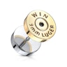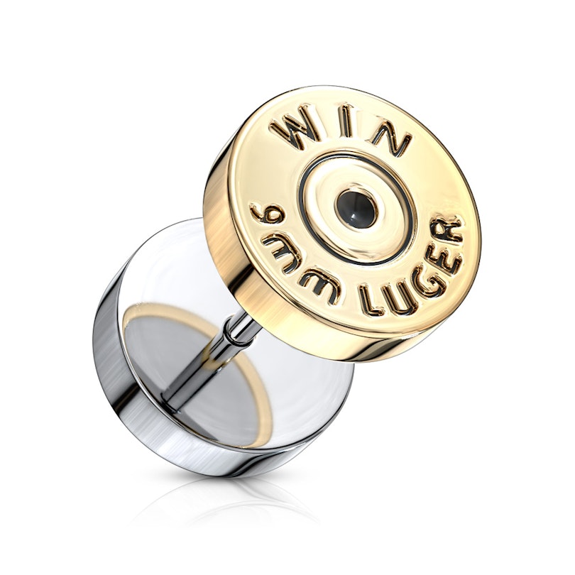 To, co vidíte na obrázku je falešný plug ve tvaru náboje. Proč falešný? Díky svému průměru 1,2 mm lze zasunout do normální propíchnuté ušní dírky, ale vytváří dojem, že máte ucho roztažené na velikost 10 mm. Když máte šperk v uchu, není vidět rozdíl. Vzhledem k velikosti plochy náušnice, vznikl dost velký prostor pro nápis. Byla by škoda, kdyby byly šperky tak malé, že by se text dal stěží přečíst.