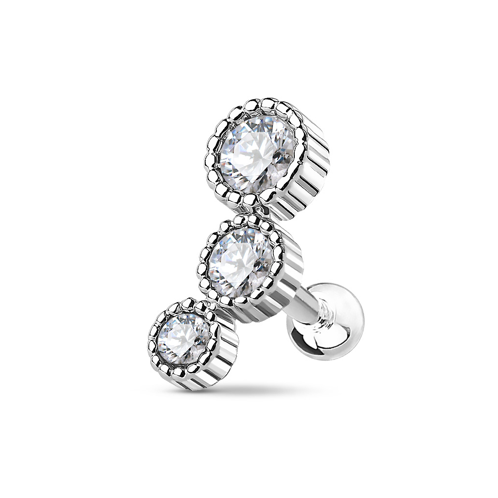Tento stylový piercing je zdobený třemi kamínky různých velikostí od nejmenšího po největší. Kamínky jsou orámovány drobnými kruhy a mají diamantový brus, díky kterému se od nich světlo odráží ze všech možných různých úhlů a tento šperk pak krásně vynikne.