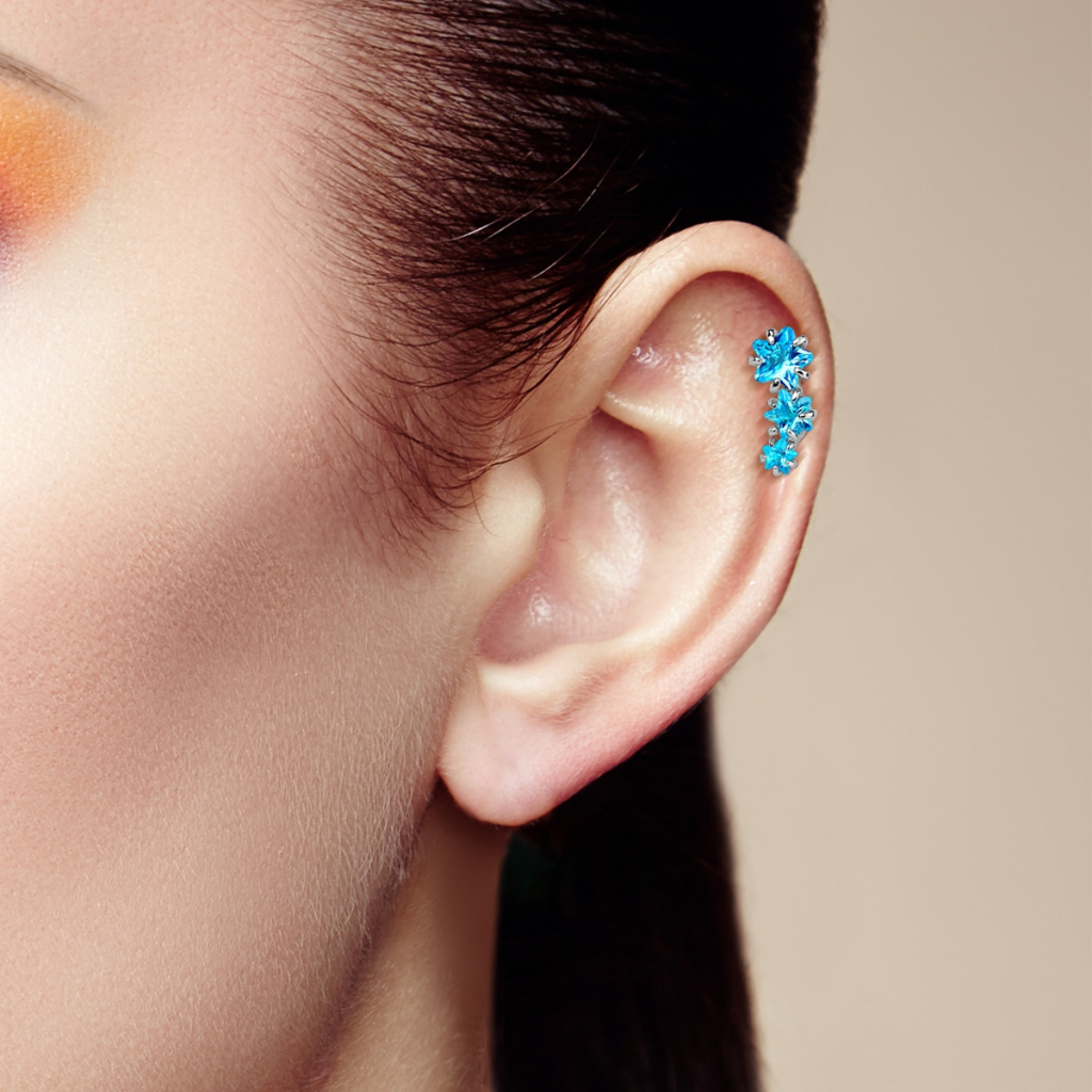Roztřpyťte svůj piercing v helixu s tímto úžasným shlukem hvězd, ozdobených nádhernými kamínky. Tento šperk má tři kamínky ve tvaru hvězdiček, které jsou umístěny jedna vedle druhé. Tento třpytivý zástup je maličko zatočen, a proto bude Vaše ucho krásně kopírovat.