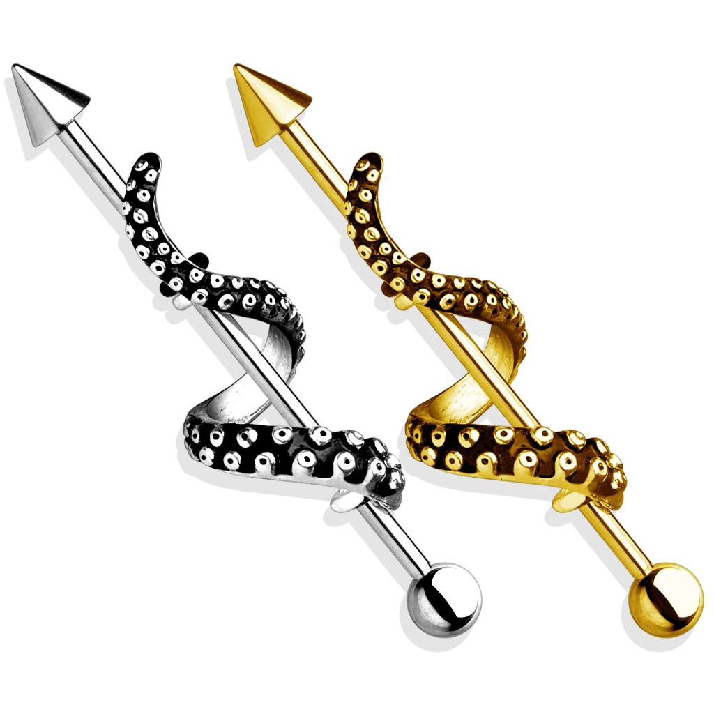 Pokud hledáte neobvyklý piercing pro Váš industrial, jste na správném místě. Tento industrial má tvar šípu, který má na jednom konci špičku, a na druhém kuličku. Co je na tomto piercingu však nejzajímavější, je to, co se nachází mezi těmito dvěma konci. Kolem tyčinky je totiž obtočené chapadlo chobotnice. Chapadlo má černé pozadí, na kterém se krásně rýsují neodmyslitelné přísavky.