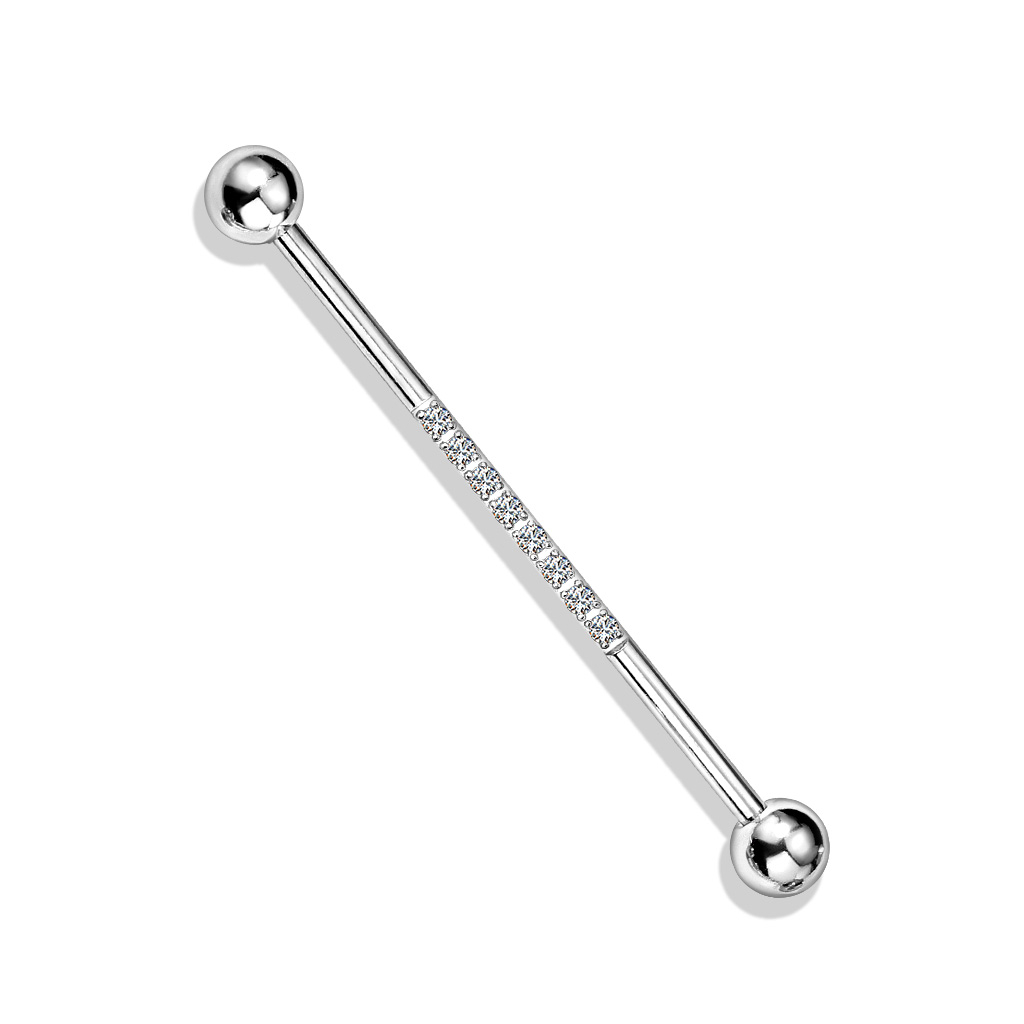 Máte-li slabost pro industriály, máme pro Vás perfektní šperk. Šperk se skládá z klasické dlouhé tyčinky s kuličkami na koncích. Zajímavostí na tomto šperku je však prostředek tyčinky - ten je ozdoben osmi kamínky, které byly precizně umístěny do jedné řady. Tyčinka šperku je vyrobena z chirurgické oceli a je k dispozici v několika barevných provedeních. Kromě barvy tyčinky si můžete zvolit i barvu kamínků, avšak to je možné pouze u základní stříbrné varianty. U barevných tyčinek je k dispozici pouze čirá barva kamínků.