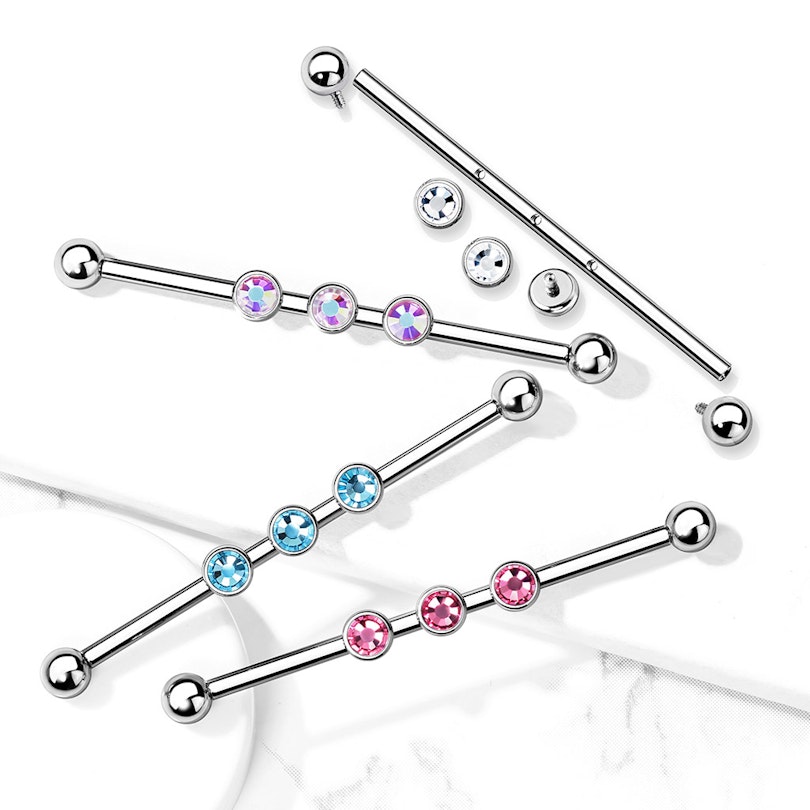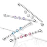 Tomuto typu šperku se říká industriál, a jeho tyčinka je 38 mm dlouhá. Industriál je speciální v tom, že jsou k jeho nošení potřeba dvě piercingové dírky, a většinou je umístěn v horní části ucha. Podle dispozicí Vašeho ucha budete muset buď odšroubovat jen jeho kuličky na koncích, nebo i ozdobné kuličky uprostřed. Ozdobné kuličky jsou k dispozici v barvách, které můžete vidět na obrázku.