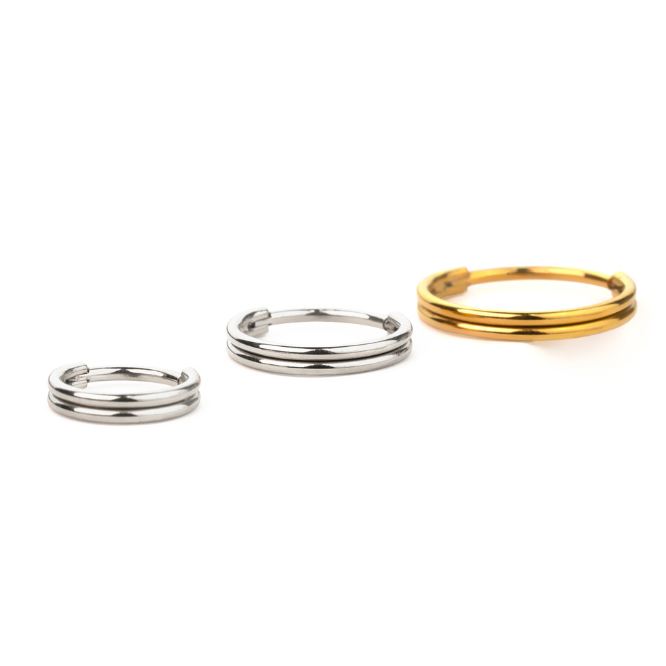 Tento kroužek s pohodlným otevíráním vypadá, jak kdyby se jednalo o dva kroužky vedle sebe, ale piercingem prochází pouze jeden jediný kroužek.