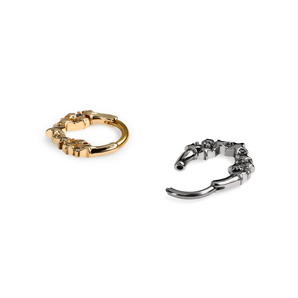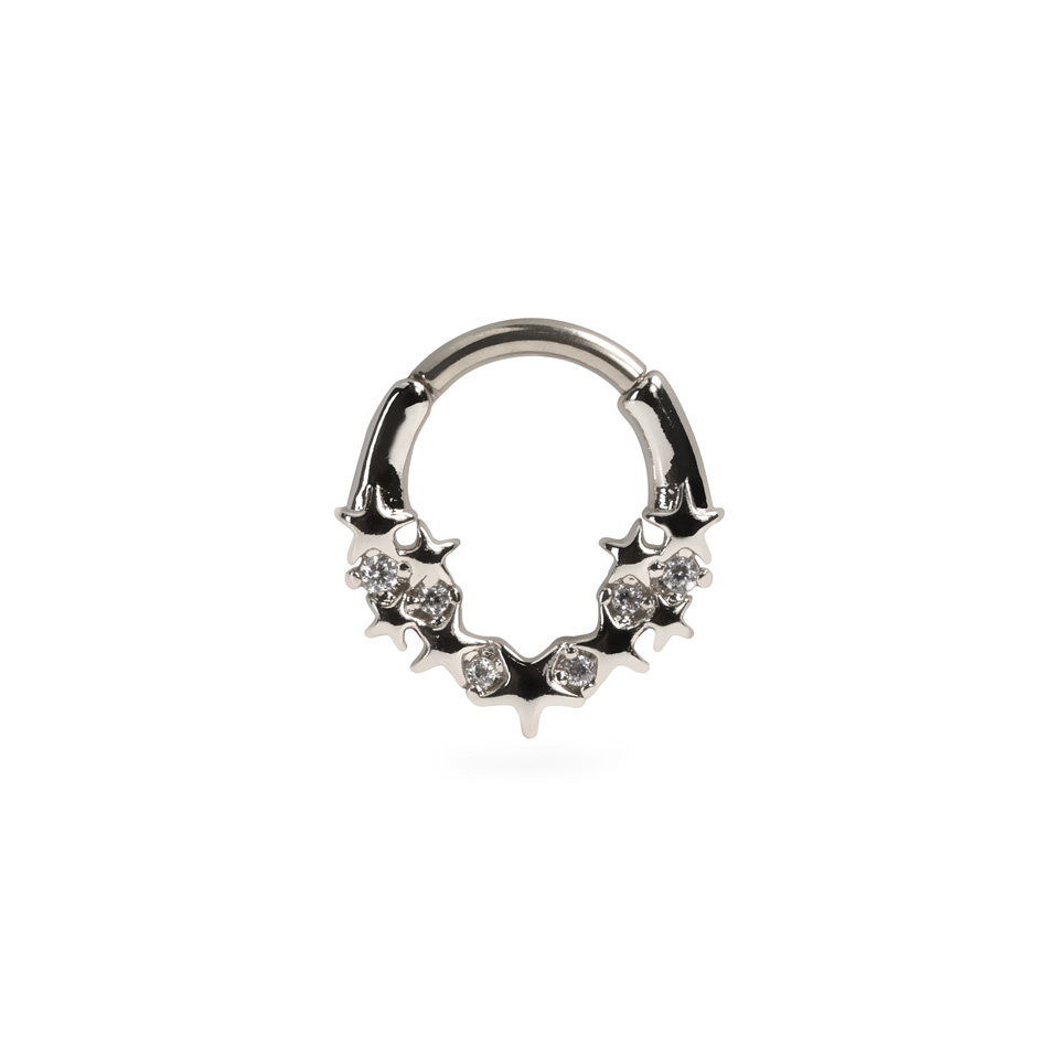 Tento kroužek s hvězdami a měsíci směřujícími dopředu bude skvělým doplňkem tvé sbírky. Díky pantu se snadno nasazuje a upevňuje do piercingu.