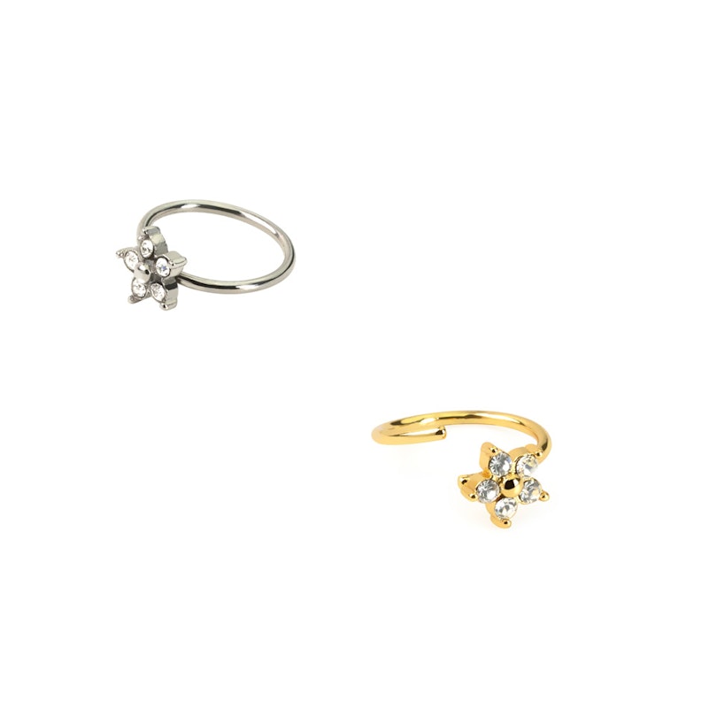 Tento jemný kroužek z chirurgické oceli je zdobený jemnou květinou, která je tvořená pěti okvětními lístky z kamínků kolem středového korálku. Je dostupný ve zlaté nebo stříbrné barvě, ale vyrobený je z chirurgické oceli, což je pevný a odolný materiál, který se nešpiní. Díky tenkému průměru je tento kroužek ideální jako piercing v nose, ale bude skvěle sedět i v helixu nebo jiném piercingu ucha. Jednoduše jej otevřete pootočením, pak jej zasunete do piercingu a opětovným pootočením jej zase zajistíte.