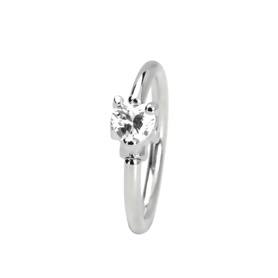 Tento kroužek s kamínkem má místo běžné kuličky kamínek ve tvaru srdce. Tlak kroužku na kuličku ji drží pevně na svém místě, ale srdíčkem je možné otáčet.