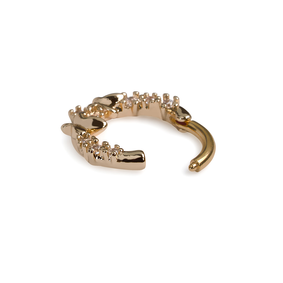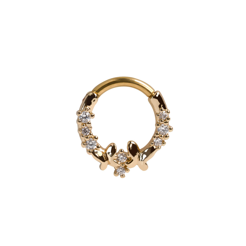 Tento extra rozkošný kroužek s motýlky směřujícími dopředu. Ti jsou zdobení drobnými krystalickými zirkony. Díky svému pantu se snadno zajistí do piercingu.