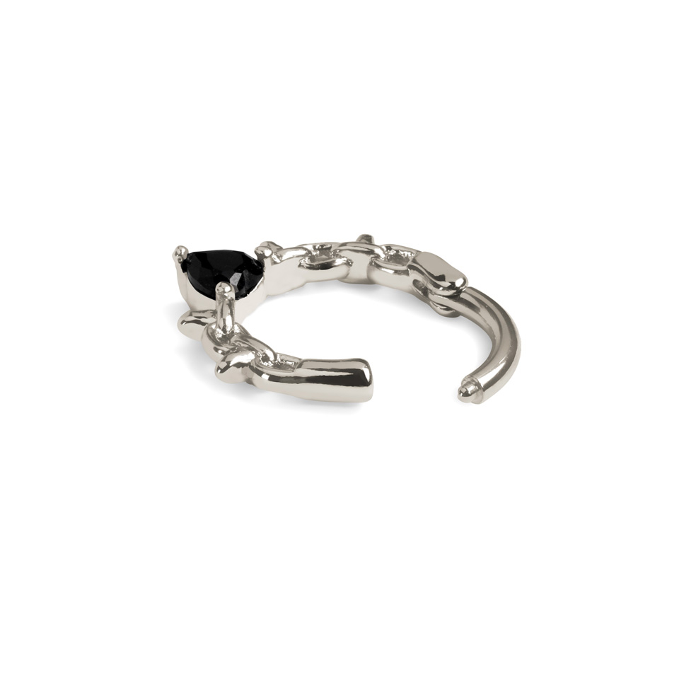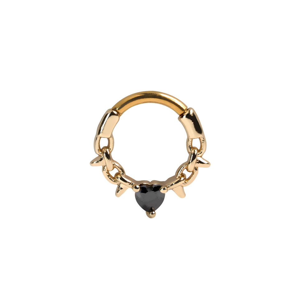 Tento kroužek, který směřuje dopředu má design ostnatého drátu s černým centrálním kamínkem ve tvaru srdce. Jelikož je vybaven pantem, lze jej snadno upevnit do piercingu.
