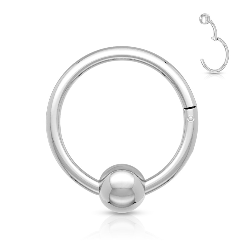 U klasických kroužků s kuličkou je to právě kulička, kterou je potřeba odšroubovat, aby bylo možné kroužek otevřít a nasadit. To však není případ tohoto kroužku. U tohoto šperku je kulička zafixovaná na spodní části kroužku a hýbat s ní tedy nejde. K otevření kroužku je potřeba vyklopit jeho kloub. Otevírání i zavírání je tedy snadné - pro uzavření kroužku stačí kloub jen zacvaknout zpátky na místo.