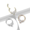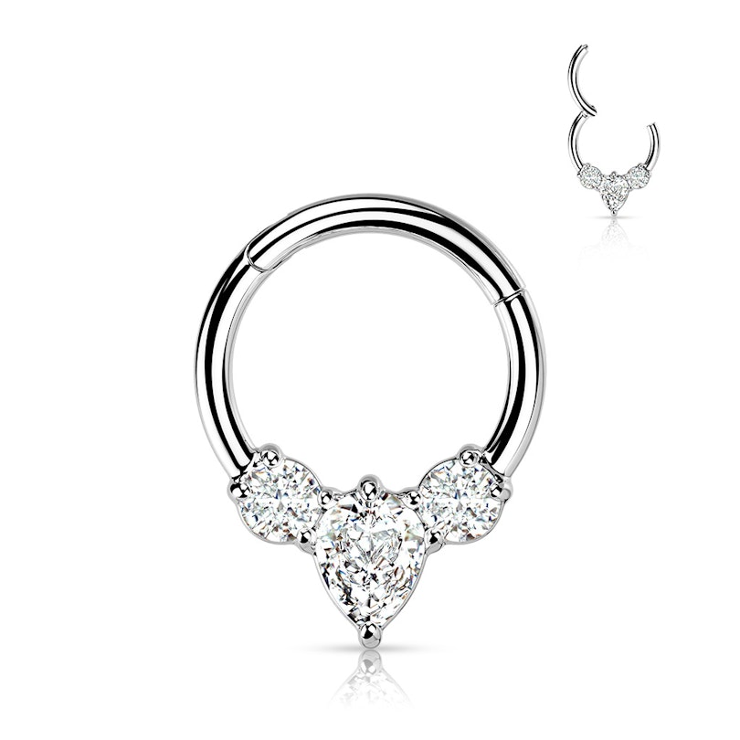 Tento kroužek z chirurgické oceli dodá vašemu piercingu potřebný lesk. Šperk je opatřen odolnou PVD povrchovou úpravou pro dosažení zářivých barev, které díky tomu vydrží déle, než standartní povrchová úprava. Kroužek má také blýskavé kamínky, konkrétně velký centrální kamínek ve tvaru hrušky a z každé strany má jeden menší kulatý kamínek. Tyto čiré kamínky jsou otočené směrem dopředu, takže se tento šperk dokonale hodí pro septum piercing a také do některých piercingů v uších - daith nebo tragus.