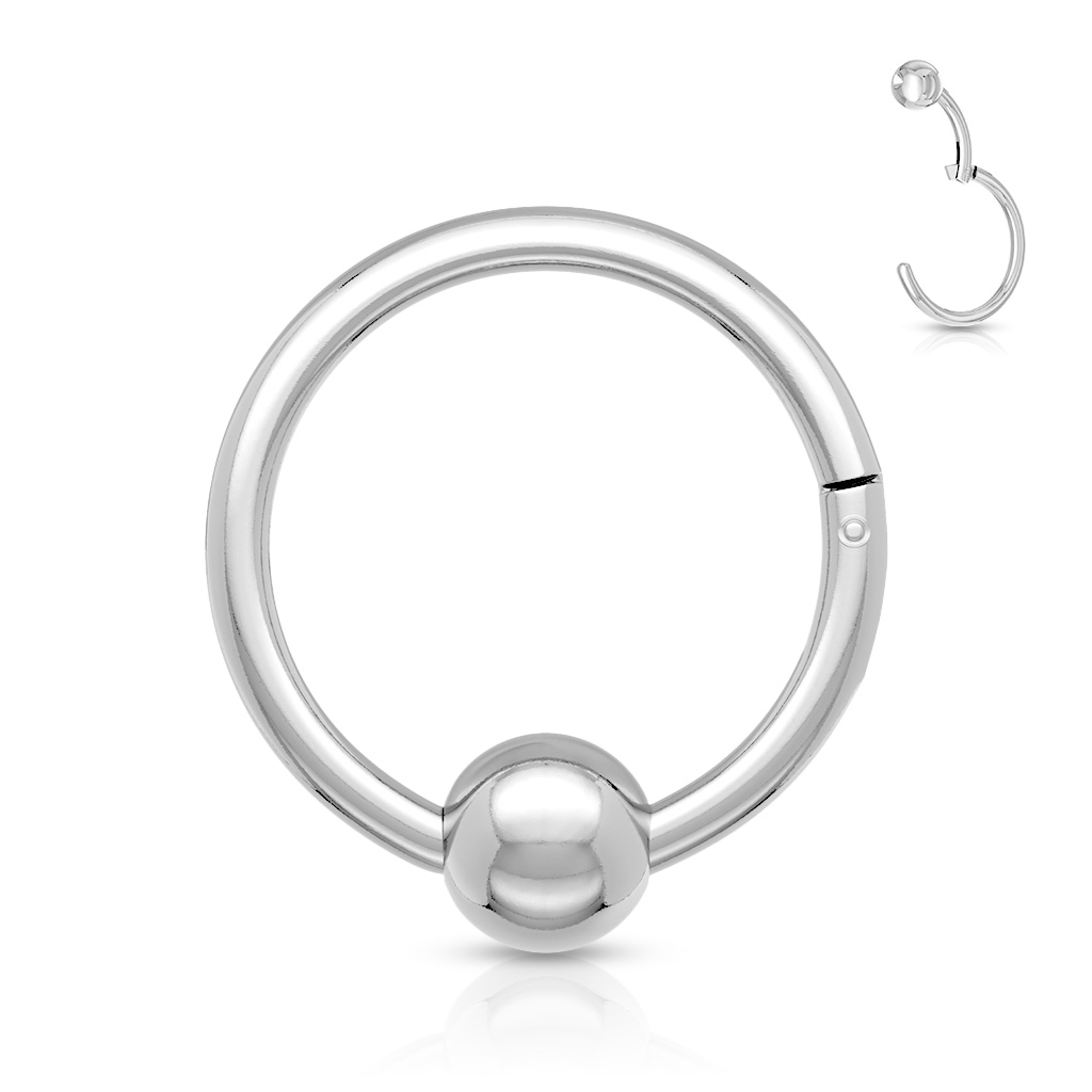 U klasických kroužků s kuličkou je to právě kulička, kterou je potřeba odšroubovat, aby bylo možné kroužek otevřít a nasadit. To však není případ tohoto kroužku. U tohoto šperku je kulička zafixovaná na spodní části kroužku a hýbat s ní tedy nejde. K otevření kroužku je potřeba vyklopit jeho kloub. Otevírání i zavírání je tedy snadné - pro uzavření kroužku stačí kloub jen zacvaknout zpátky na místo.