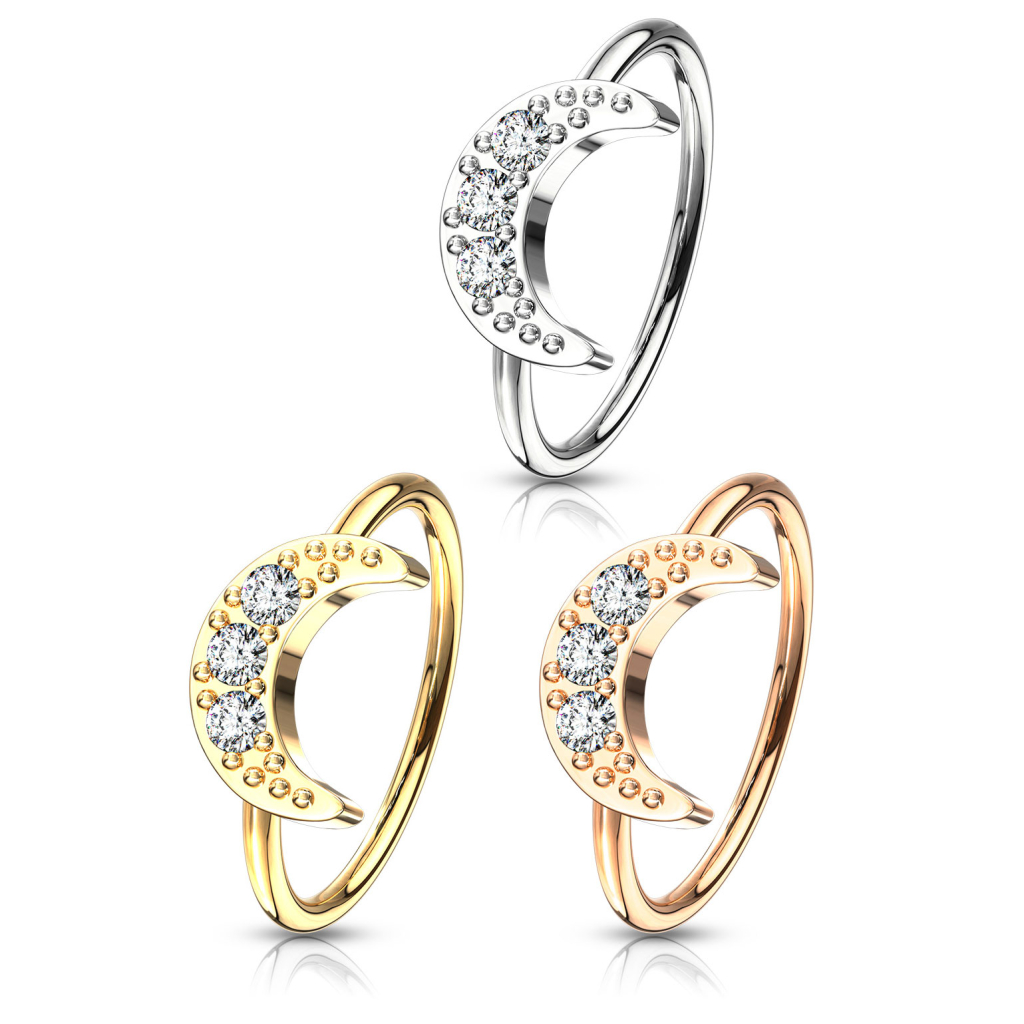 Bezešvý kroužek z chirurgické oceli s půlměsícem. Tento půlměsíc je uprostřed ozdobený třemi čirými kamínky a ty jsou dále obklopeny drobnými cvočky.