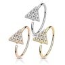 Na přední straně je kroužek ozdobený trojúhelníkem, který je posetý spoustou malých čirých kamínků, které jasně září.