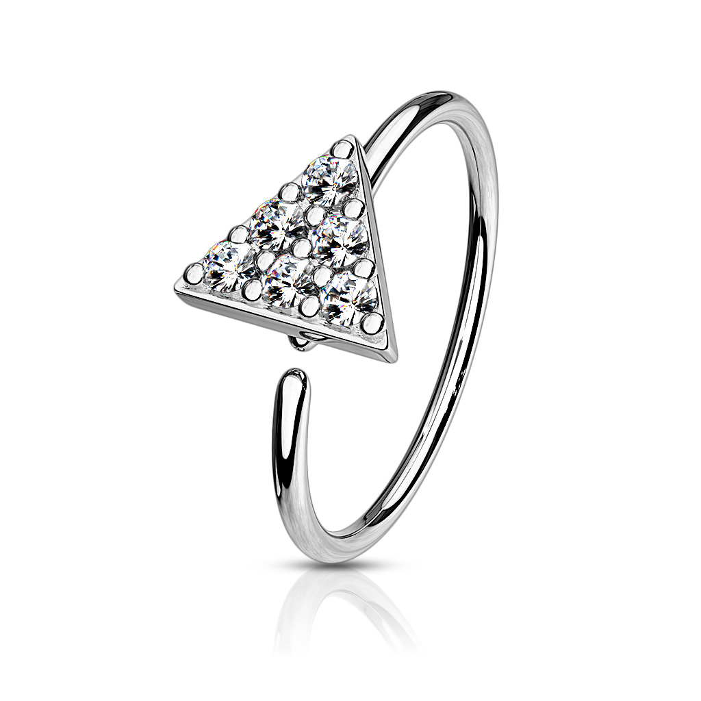 Na přední straně je kroužek ozdobený trojúhelníkem, který je posetý spoustou malých čirých kamínků, které jasně září.