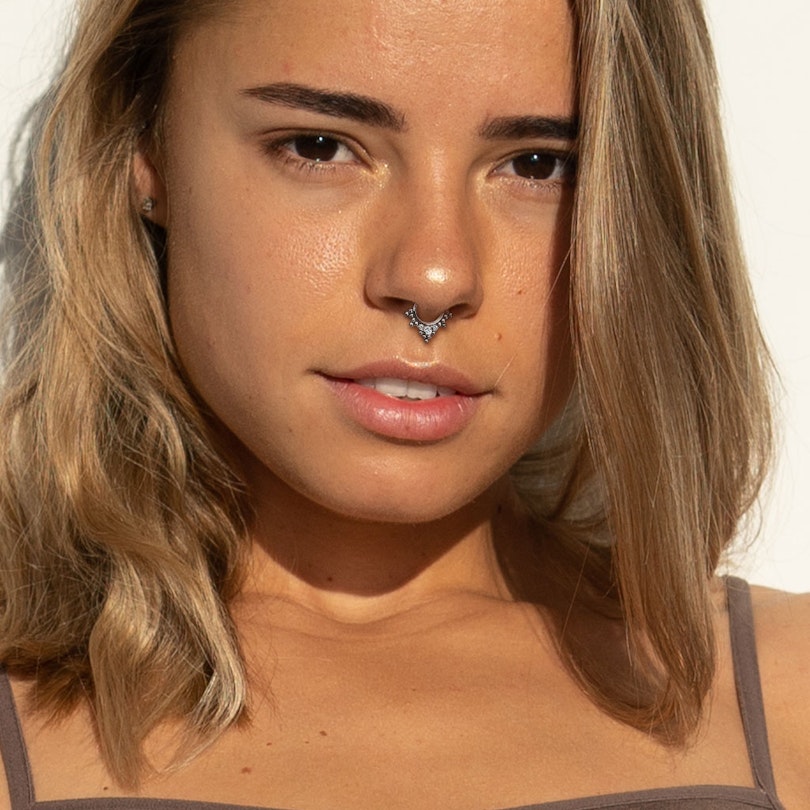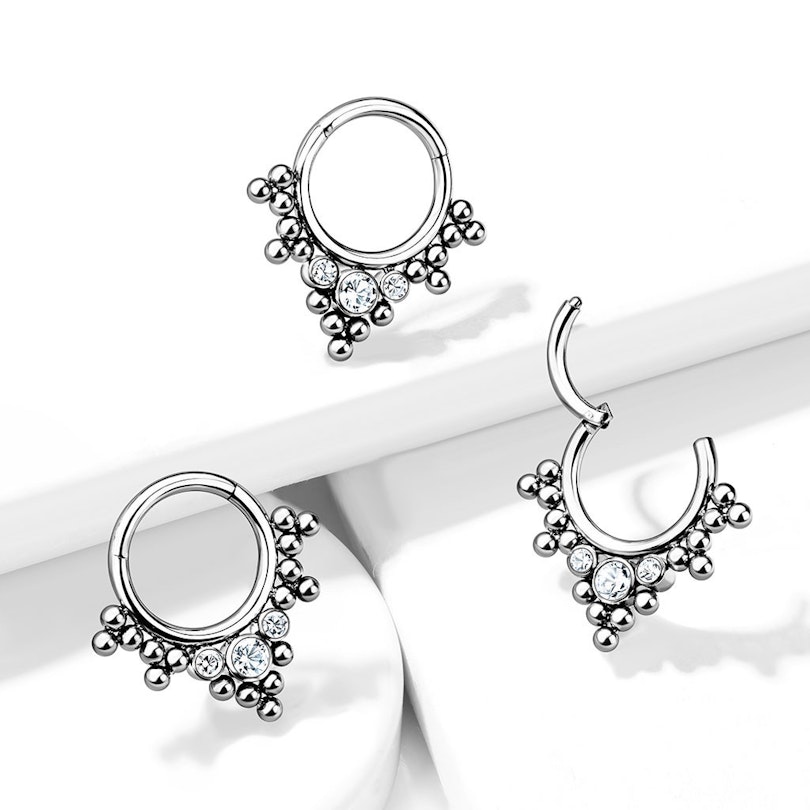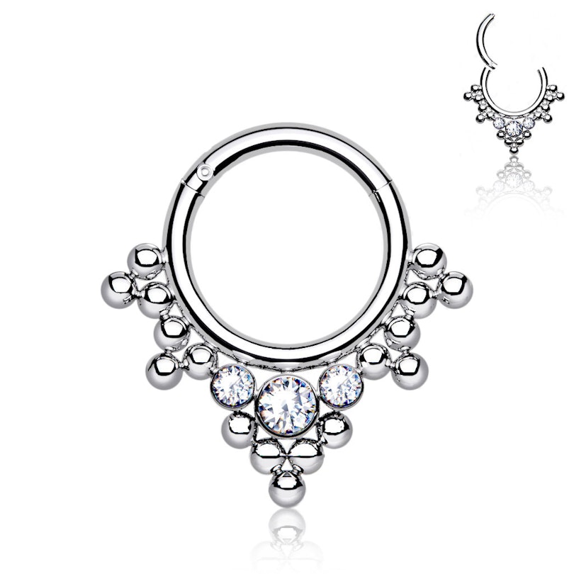 Kroužek, který vidíte na obrázku nemá žádné oddělitelné části. Když si budete šperk nasazovat nemusíte se bát, že byste nějakou část šperku ztratili. Důvodem je malý otevírací kloub, který spojuje kroužek se zavíráním. Zavírání je malý segment, který se otevírá a zavírá jednoduchým kliknutím. Když je kroužek na svém místě jednoduše ho zacvakněte zase zpátky. A kde má své místo? To je na vás. Můžete jej nosit jako septum nebo jako různé piercingy ucha, záleží jen na vaší anatomii.