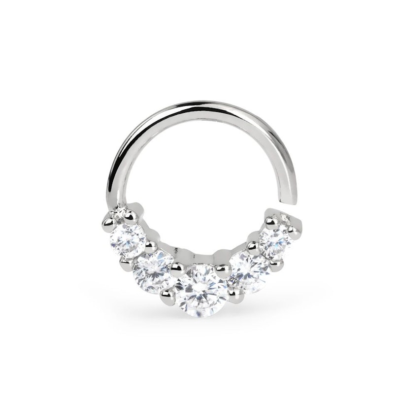 Kroužku, který můžete vidět na obrázku, se říká endless ring. Nejde o to, že by tento kroužek neměl žádný konec, ale spíš o to, že tak vypadá. Kroužek se dá otevřít zkroucením jeho konců do stran (jako spirála). Po nasazení jej stačí vrátit do původní polohy.