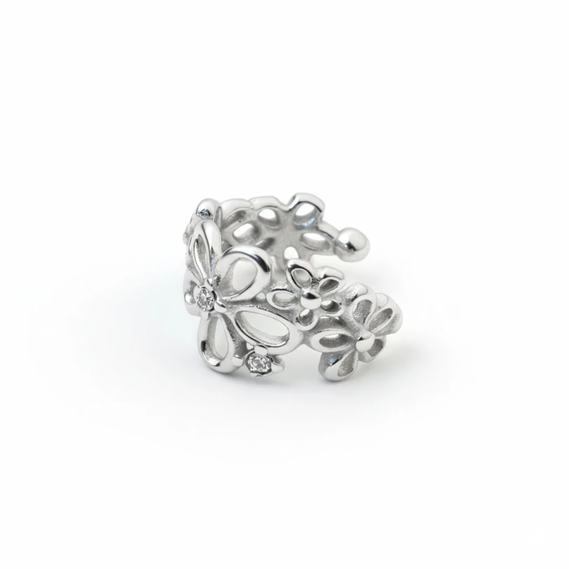 Tento jemný klips má jednoduché květy různých velikostí, které se jednoduše obtočí kolem vašeho ucha. Středy větších květů tvoří drobné kamínky, které tomuto šperku dodávají jemný lesk. Na koncích šperku jsou malé kuličky, které zajišťují to, že se šperk pohodlně nosí. Díky tomu, že je klips vyrobený z chirurgické oceli, se tento šperk nezabarví ani nezmatní. Je to skvělý šperk, který vám pomůže vytvořit si krásnou ozdobu ucha bez nutnosti dalšího piercingu.