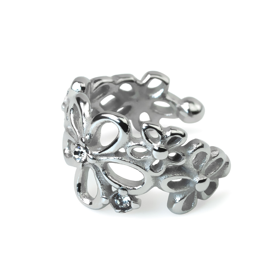 Tento jemný klips má jednoduché květy různých velikostí, které se jednoduše obtočí kolem vašeho ucha. Středy větších květů tvoří drobné kamínky, které tomuto šperku dodávají jemný lesk. Na koncích šperku jsou malé kuličky, které zajišťují to, že se šperk pohodlně nosí. Díky tomu, že je klips vyrobený z chirurgické oceli, se tento šperk nezabarví ani nezmatní. Je to skvělý šperk, který vám pomůže vytvořit si krásnou ozdobu ucha bez nutnosti dalšího piercingu.