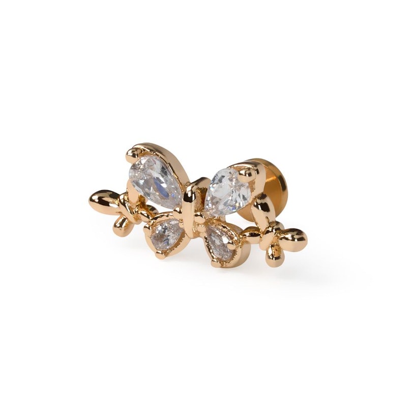 Tato labreta s třemi motýlky je plná hravých detailů. Uprostřed je větší motýl, který je tvořen z čirých kamínků, které jsou zasazeny do krapen, zatímco po obou stranách jsou dva menší motýlci ve zlaté barvě, kteří vytváření jemné trio plné charakteru.