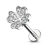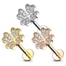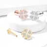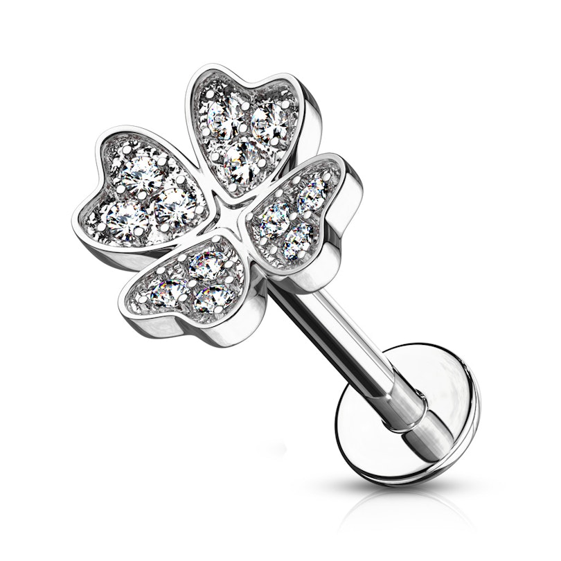 Labreta, kterou vám představujeme je nahoře ozdobena krásným čtyřlístkem. Na každý z jeho čtyř listů byly přilepeny tři kamínky. Všechny listy se ohýbají směrem dovnitř ke středu, což šperku dodává hloubku, takže vypadá jako skutečný jetel. Ten je vyroben z mosazi a potažen barevnou vrstvou, která odpovídá zbytku piercingu.