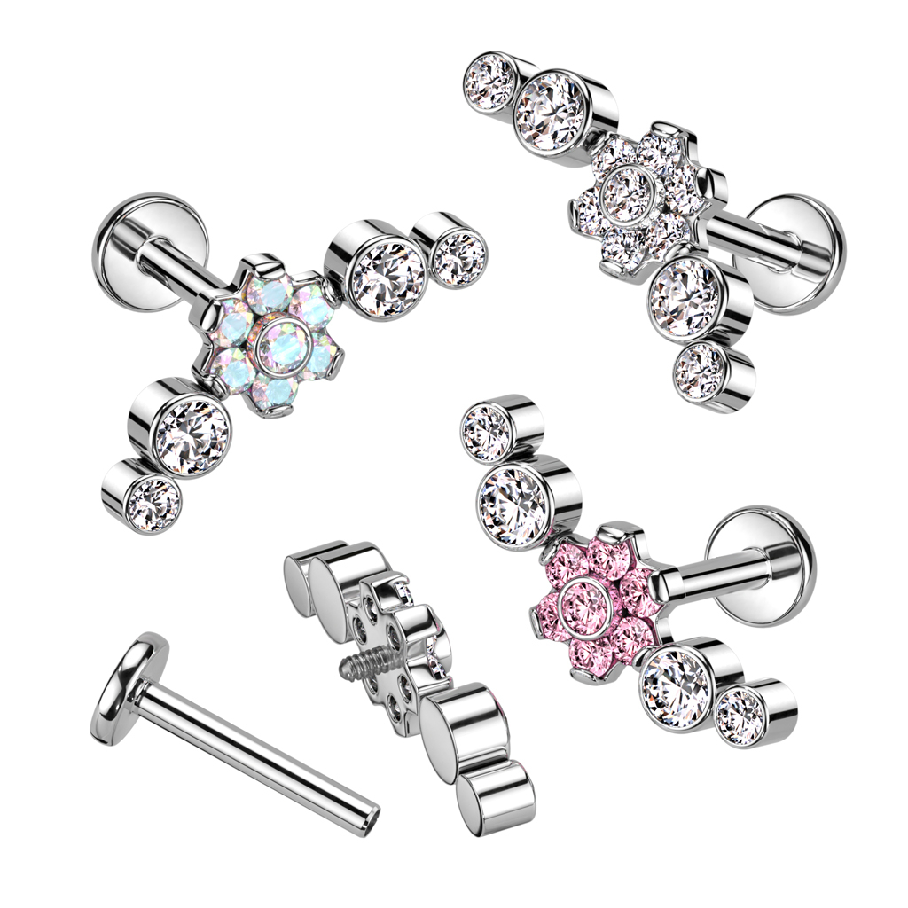 Labreta, kterou vidíte je vyrobena z titanu, což je jeden z nejodolnějších materiálů a proto je pro piercingy nejvíce doporučovaným materiálem. Má vnitřní závit, což znamená, že sloupek má uvnitř závit. Horní ozdobná část je vybavena závitovou tyčinkou, kterou zašroubujete do sloupku, čímž se zamezí poranění kůže při zavádění labrety do piercingové dírky.