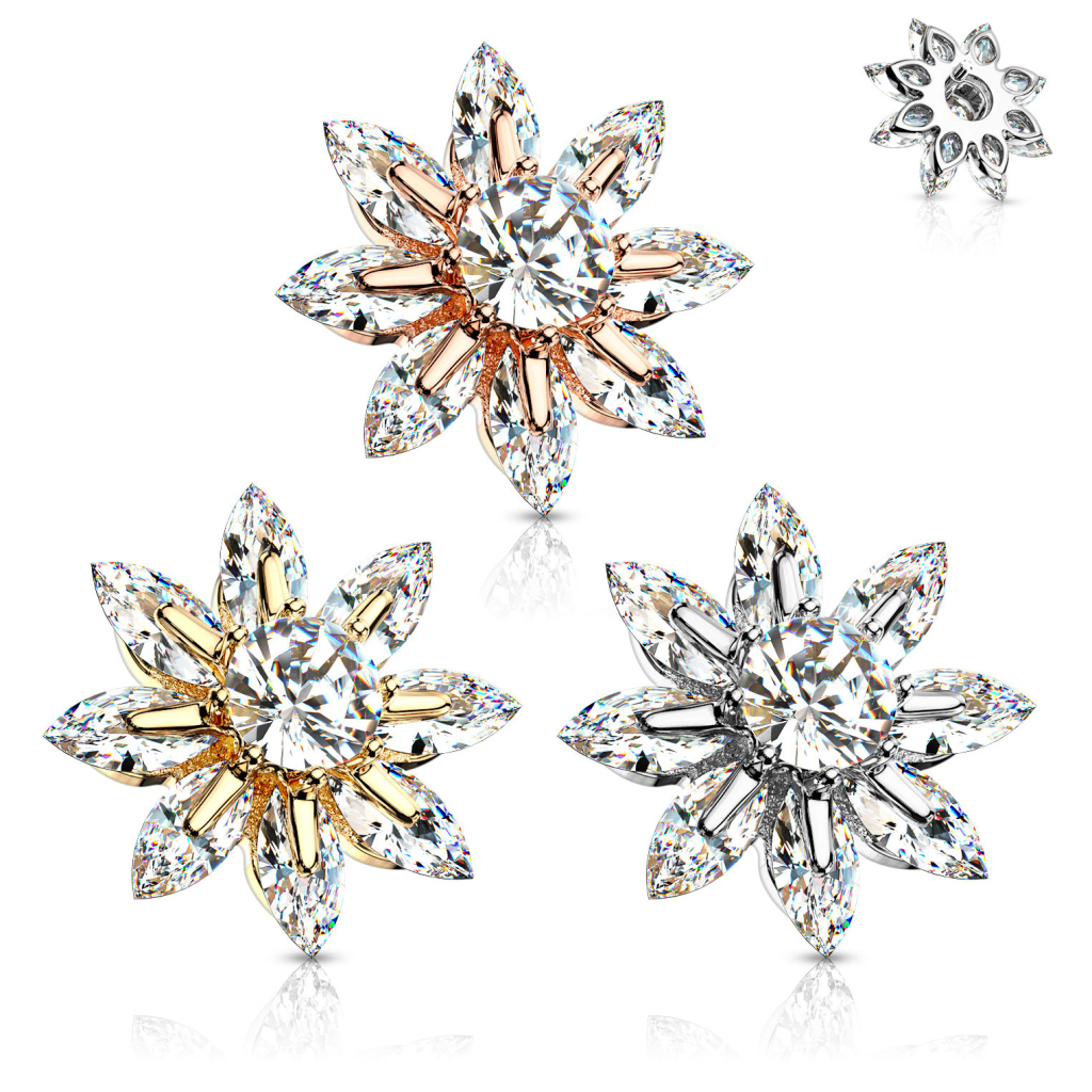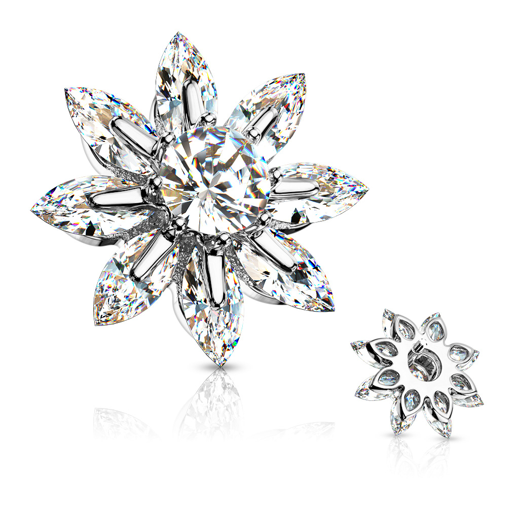 Zezadu šperku je upevněn malý šroubek z chirurgické oceli. Tento šroubek slouží k našroubování mikrodermálu do Vaší podkožní kotvy. Kvůli způsobu, kterým je prostřední kamínek na tomto šperku usazen, není šroubek umístěn uprostřed, ale více ke kraji. Na jeho funkčnost to však nemá žádný vliv.