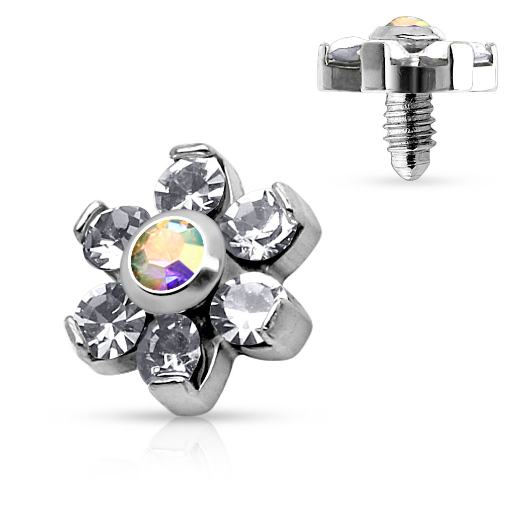 Tento úžasný piercing se skládá z šesti okvětních lístků, tvořících nádhernou květinu. Na každém lístku je jeden krásně lesklý kamínek, a uprostřed květiny je potom ještě jeden větší. Kamínky na okvětních lístcích drží na šperku krapny.