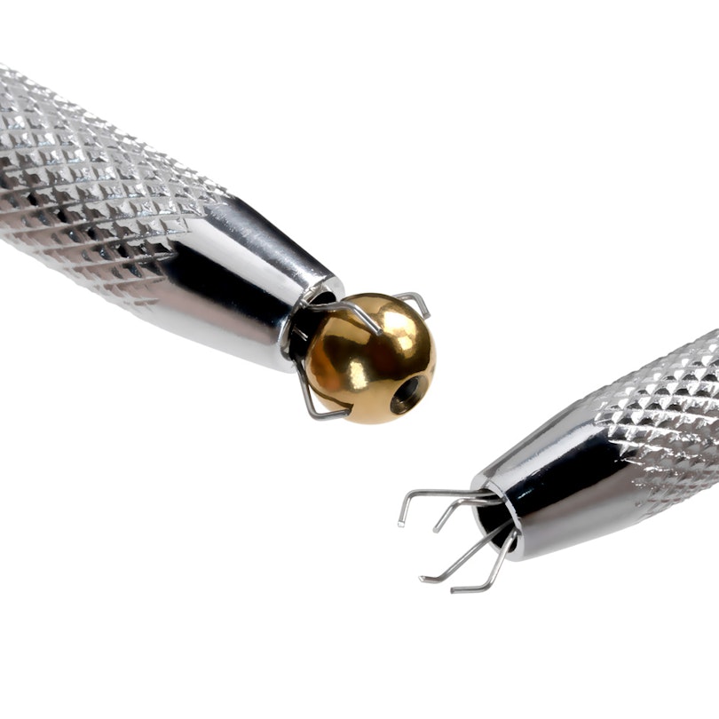 Tento nástroj má čtyři tenké hroty, které se při stlačení rozevřou směrem od špičky a udrží kuličky o velikosti 3 až 6 mm, zatímco je budete šroubovat do tyčinky, kroužku nebo labrety. Jen se ujistěte, že otvor nebo závit kuličky směřuje ven, takhle funguje jeho kouzlo.