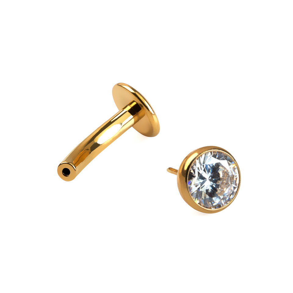 Horní kulička s kamínkem i spodní disk mají v průměru 5 mm. Tento šperk je k dispozici ve zlaté nebo stříbrné povrchové úpravě.