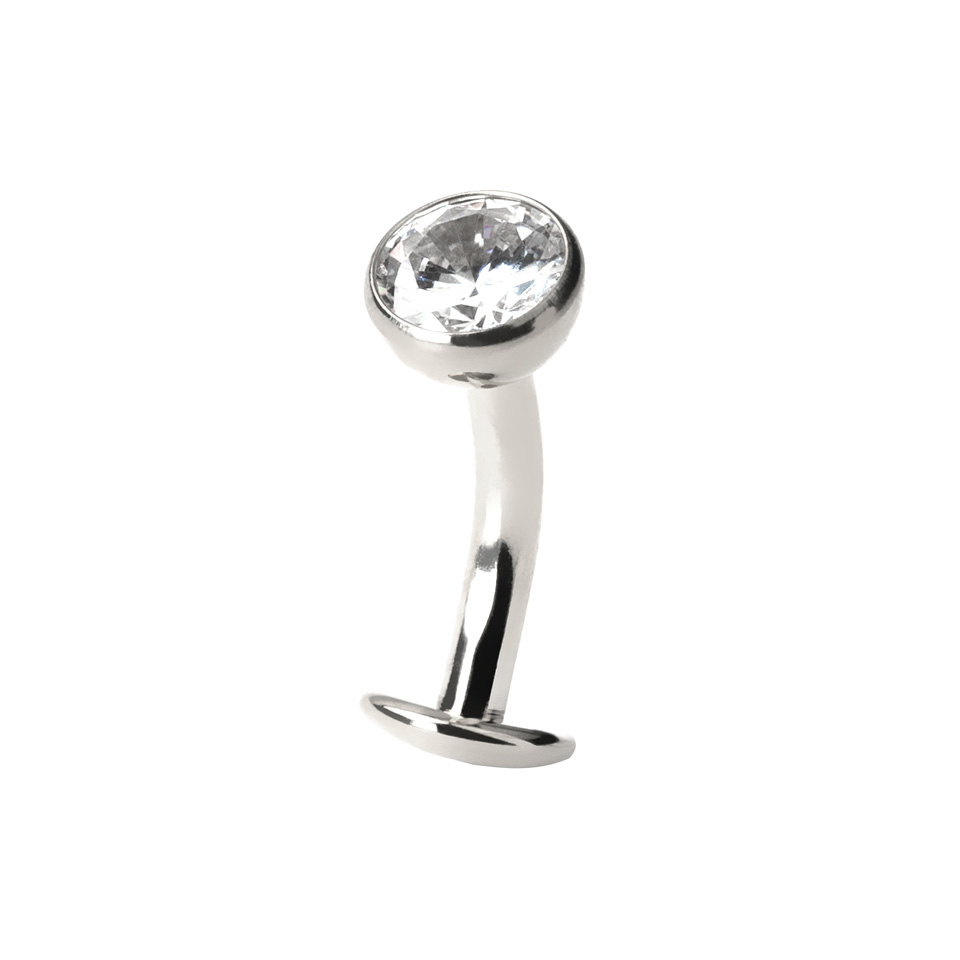 Tento obrácený piercing do pupíku má horní kuličku zdobenou čirým zirkonem a sedí nad samotným pupíkem. Druhý konec je vybaven plochým diskem, který diskrétně sedí v pupíku a vytváří dojem, že se šperk vznáší.