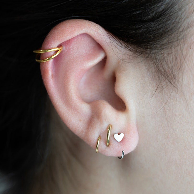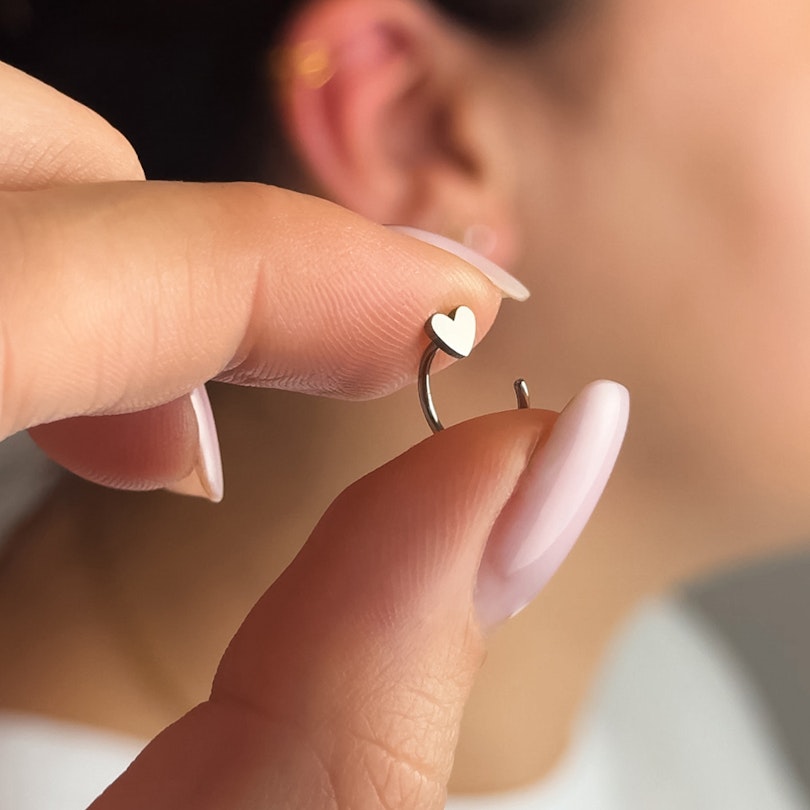 Otevřený titanový kroužek se srdíčkem je přesně ten nenáročný drobný doplněk, který vašemu vrstvenému looku na uchu chybí. Jeho otevřený oblouček se bez námahy navlékne do lalůčku. Stačí protáhnout otevřený konec skrz dírku, otočit dopředu a nechat přirozeně dosednout. Pohodlně sedí jak na hlavním lalůčku, tak na horním, nebo v kombinaci s dalšími kroužky. Srdíčko vždy směřuje dopředu pro čistý, promyšlený vzhled.
