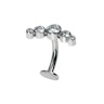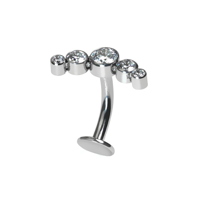 Tahle titanová otočená činka do pupíku je zdobená pěti kamínky, které jsou lunetově osazené. Jelikož je šperk vyroben z titanu je hypoalergenní a voděodolný. Zároveň je vybaven push-in zavíracím mechanismem, což znamená, že k upevnění do piercingu ti stačí mírně ohnout tyčinku a zasunout ji do dutého dříku.
