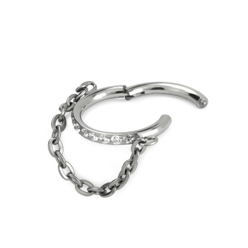 Titanový kroužek s kloubovým zapínáním s řadou jemných kamínků a řetízkem. Ten je připevněn na obou stranách, přibližně v polovině délky, aby visel jen kousek pod spodní částí kroužku.
