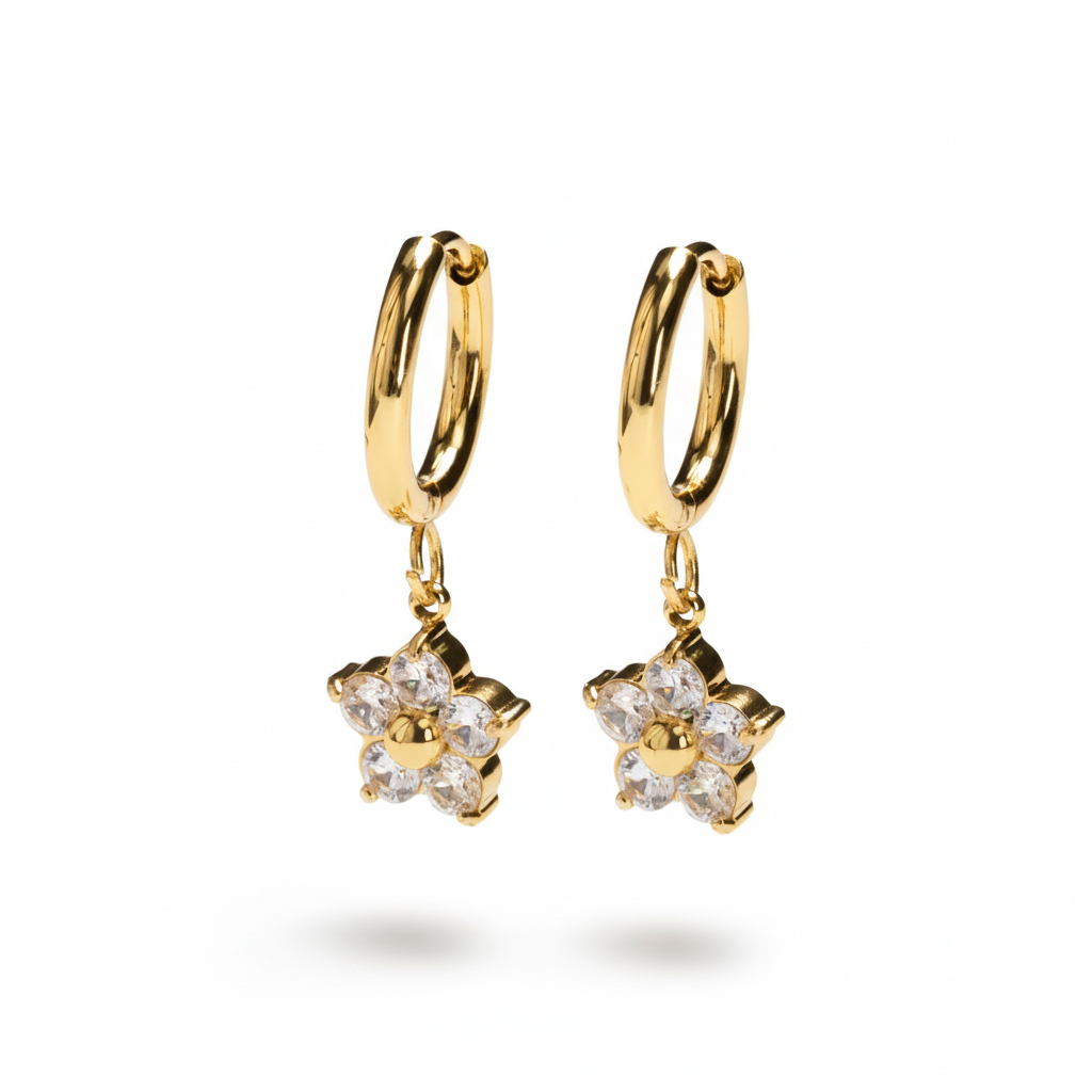 Pár kroužků s květinovým přívěskem je jak dělaný na to, aby upoutal pozornost. Každý kroužek má malý květ osazený kamínky v krapnách, který přidá přesně tolik detailu, aby při pohybu zaujaly. Jsou to ty náušnice, na které se lidi ptají. Mají pantové zapínání, takže se snadno nasazují a pohodlně nosí. K dispozici jsou ve zlatém a stříbrném barevném provedení.