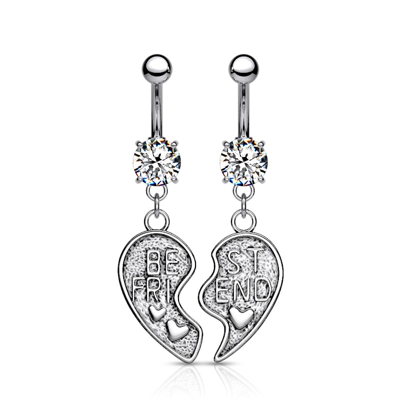 Chcete se svojí nejlepší kamarádkou všem ukázat vaše skvělé kamarádství pomocí speciálního šperku? Nabízíme Vám tedy skvělou příležitost pořídit si dva piercingy do pupíku, každý s jednou polovinou srdce, a to za velmi přátelskou cenu. Pokud přiložíte obě části srdce k sobě, dohromady tvoří nápis ‘BEST FRIEND’, tedy nejlepší kamarád/ka.